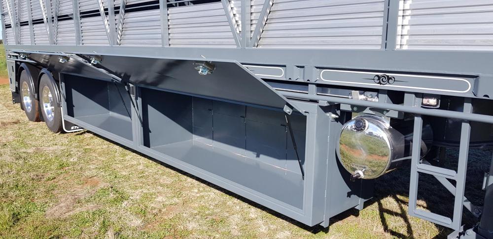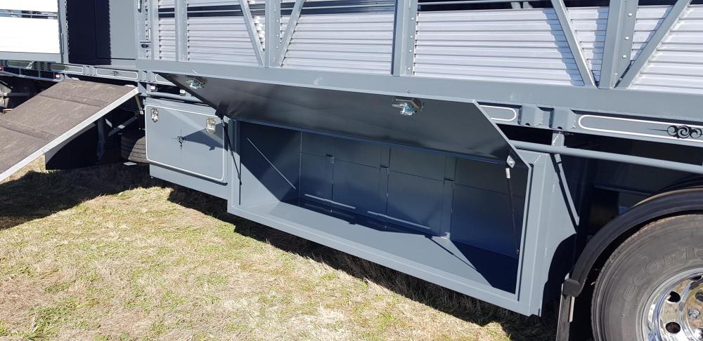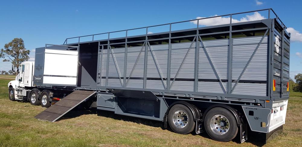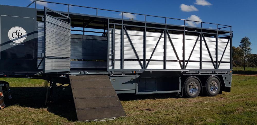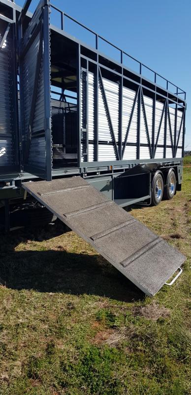 Features: • 40- 48ft trailers • Full width rear door • Side load with ramp • Hay racks • Roof options • 10 Stud or Spider • Airbag or spring • Galvanised Lift up grates for ease of cleaning • Sand blasted and 2 pak painted • New wiring lume with LED tail and clearance lights.